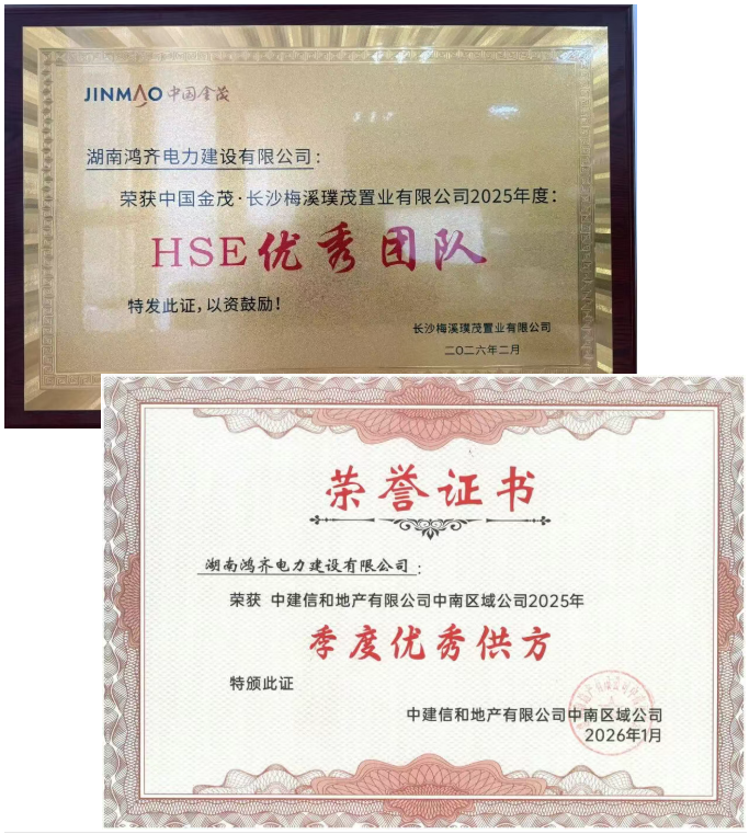 深耕电力工程设计与施工领域十余年,鸿齐电力始终坚持“让每个客户用电无忧和为客户创造价值”的经营理念,凭借专业的技术与高效的履约能力,赢得了业主单位的高度认可。在过去的2025年,公司相继收获了来自中国石化、中国金茂、中建信和及红太阳新能源等多家重点合作伙伴授予的多项荣誉。